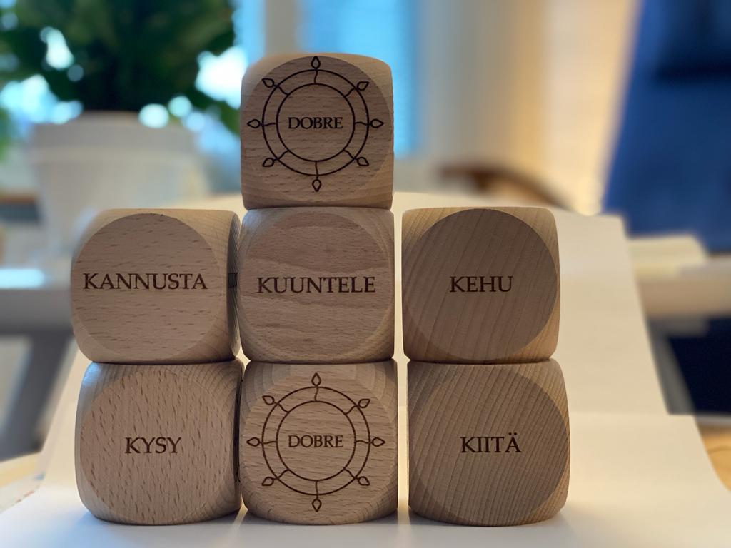 Työnohjauksen alussa laitoin Dobre-nopan kiertämään. Kierroksella syntyi hienoja kehittämisideoita, palautetta tiimille, kehuja niin itselle kuin muille. Noppa synnytti keskustelua, joka muuten olisi jäänyt pimentoon.